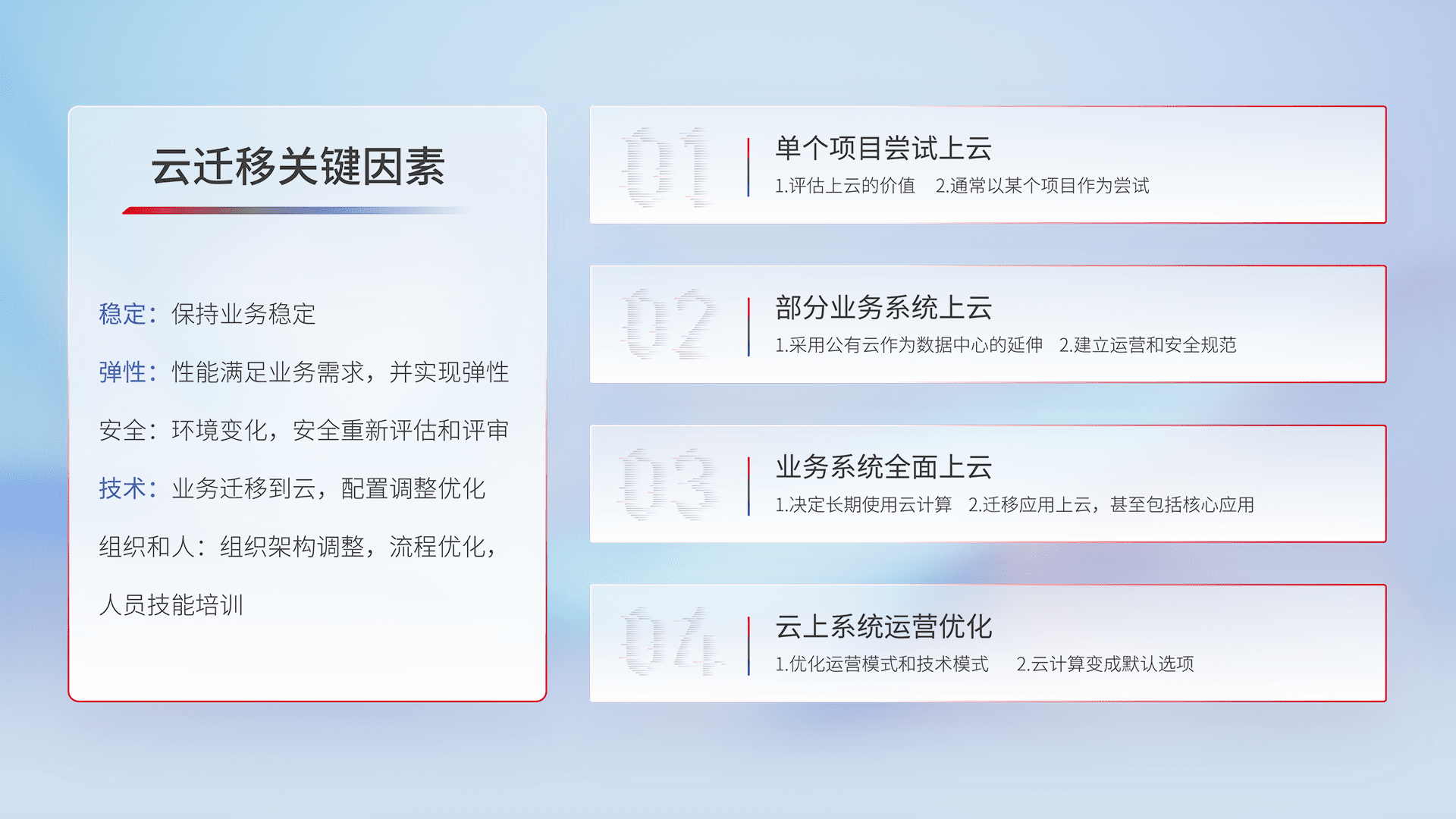 结合实际业务,,从规划设计、、、、云平台选型、、、云原生改造、、、、数据迁移、、、集成交付,,,,迁移全过程为客户识别最佳上云路径,,,,做好风险识别管理,,设计网络架构、、、身份权限、、、安全审计合规、、操作审计、、、日志审计、、、、监控告警策略、、、多站点容灾设计等,,对云上基础设施进行整体规划,,,,提升IT治理水平,,,以满足弹性、、、高可用、、、高性能的需求。。。。