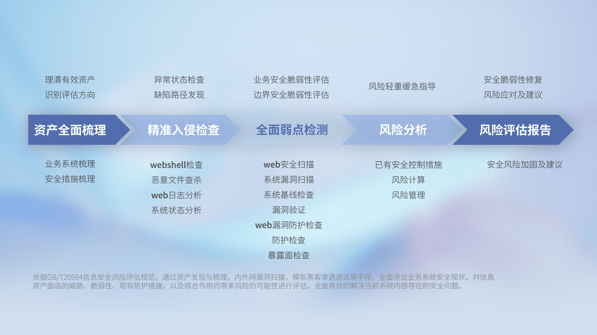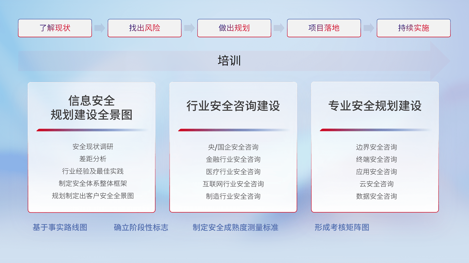 针对客户行业特性,,,以专业的安全服务+多厂商联合解决方案提供专属的一站式安全管理服务,,帮助客户全面感知网络空间威胁,,,基于识别、、检测、、、、分析、、防护、、监测、、响应的服务理论模型,,,从方案咨询、、、集成交付、、评估验证、、、、优化加固、、运维运营,,,,致力于为客户提供完整的闭环管理式安全服务。。。以实战经验为客户打造高抵御风险的安全体系,,帮助客户发现威胁、、、对抗威胁、、、、处置威胁,,不断积累安全对抗能力,,,,持续保障数字化安全。。。。